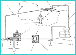 1. 高壓油泵進油管 2. 減振器 3. 回油節(jié)流孔 4. 高壓油泵 5. 回油管 6. 噴油嘴 7. 連接塊 8. 手動注油泵 9. 注油旁通閥 10. 燃油箱 11. 進油管 12. 燃油粗濾器(CWR 沒有) 13. 燃油壓力表 14. 燃油細濾器 15. 溢流閥 16. 燃油輸送泵