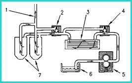 1. 去主油道的管路 2. 機油濾清器旁通閥 3. 機油冷卻器 4. 機油冷卻器旁通管 5. 機油泵 6. 油底殼 7. 機油濾清器