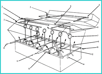 1. 去搖臂軸的油道 2. 堵信住的油道 3. 堵頭 4. 去高壓油泵的油道 5. 搖臂軸 6. 去氣門挺柱的油道 7. 凸輪軸軸承孔 8. 去渦輪增壓器的油道 9. 活塞冷卻噴嘴 10. 去正時齒輪殼體的油道 11. 缸體主油道的供油管 12. 去前惰齒輪的油道 13. 缸體中的主油道 14. 主軸承孔