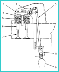 1. 氣門過橋 2. 搖臂 3. 推桿 4. 氣門彈簧旋轉(zhuǎn)壓盤 5. 氣門彈簧 6. 氣門導管 7. 氣門 8. 氣門挺柱 9. 凸輪軸