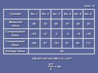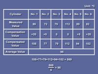 康明斯Cummins QSK23發(fā)動機(jī)看另外一組數(shù)據(jù),我們先根據(jù)氣缸所在位置對每缸的測試數(shù)據(jù)進(jìn)行補(bǔ)償。下一步,計(jì)算平均值。最后,把每個缸的數(shù)據(jù)和平均值作對比。 在此例中,2號氣缸低于平均值超過20℃,被認(rèn)為是不正常的。