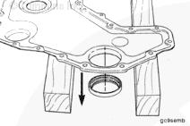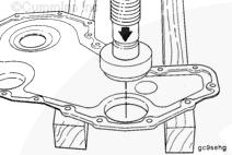 用木塊將前齒輪室蓋支撐在平坦的工作面上。使用適當(dāng)?shù)臎_頭和錘子,從后向前將舊密封件頂出前齒輪室蓋。