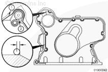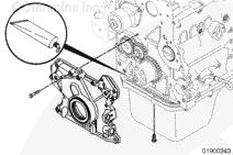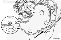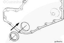 注: 安裝三個(gè)導(dǎo)向銷(零件號(hào) 3164977)以改進(jìn)前蓋和前油封與齒輪室和曲軸的對準(zhǔn)情況。