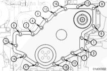 注: 安裝前齒輪室蓋前,先確保在缸體、油底殼與前齒輪室蓋的相互接合面上涂敷了密封膠(零件號(hào) 3164067)。